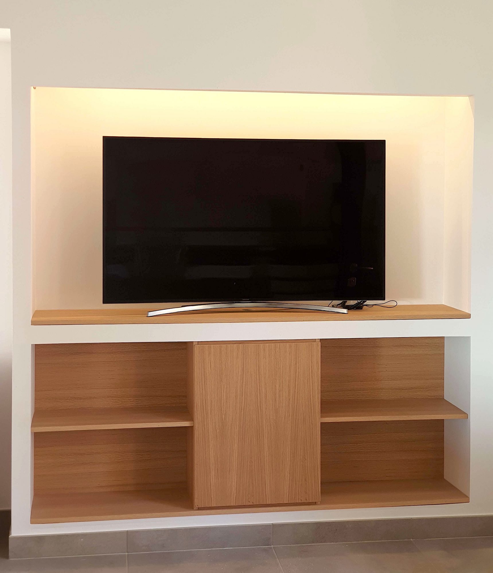 Maison ancienne rénovée, intégration d’un téléviseur et rangement du matériel associé.