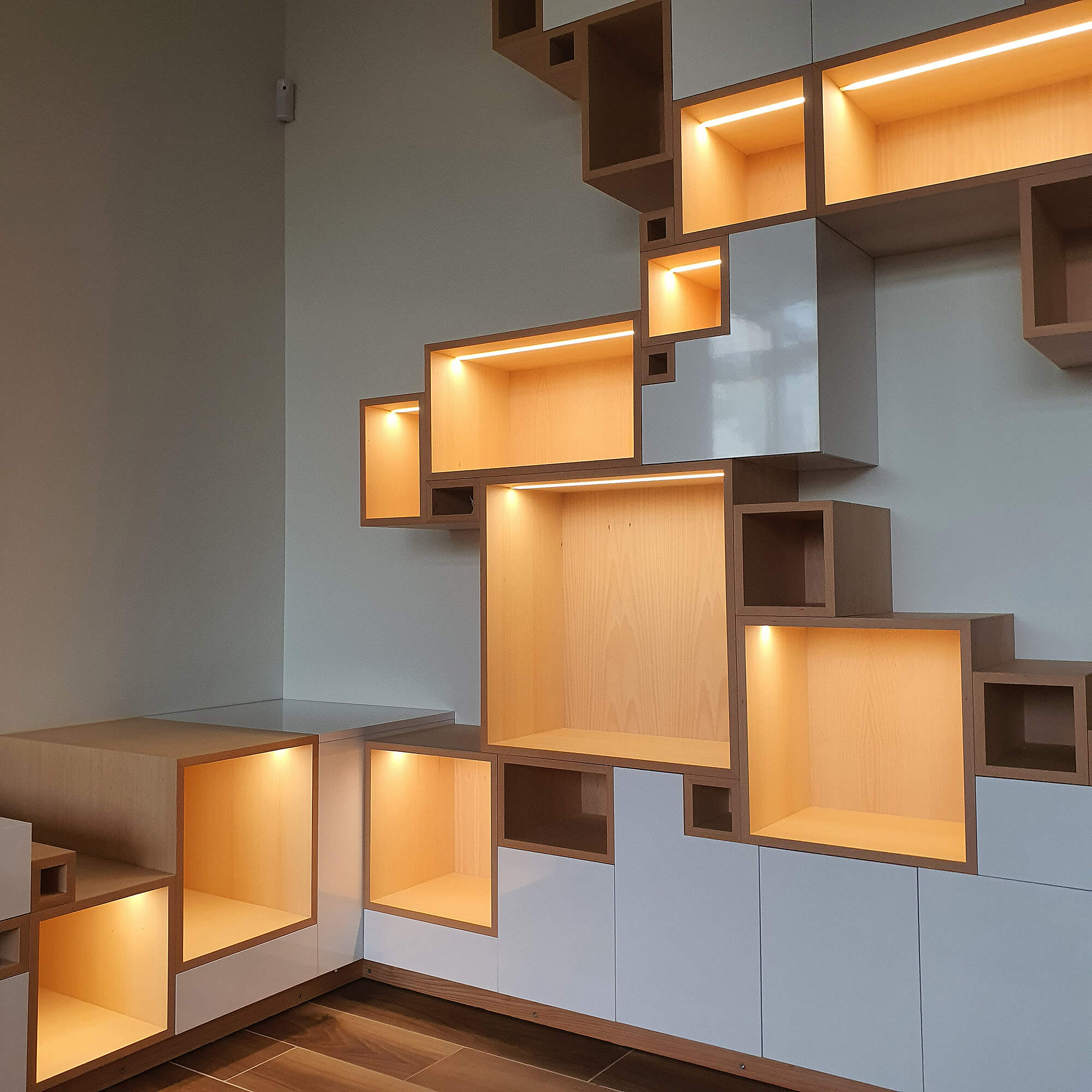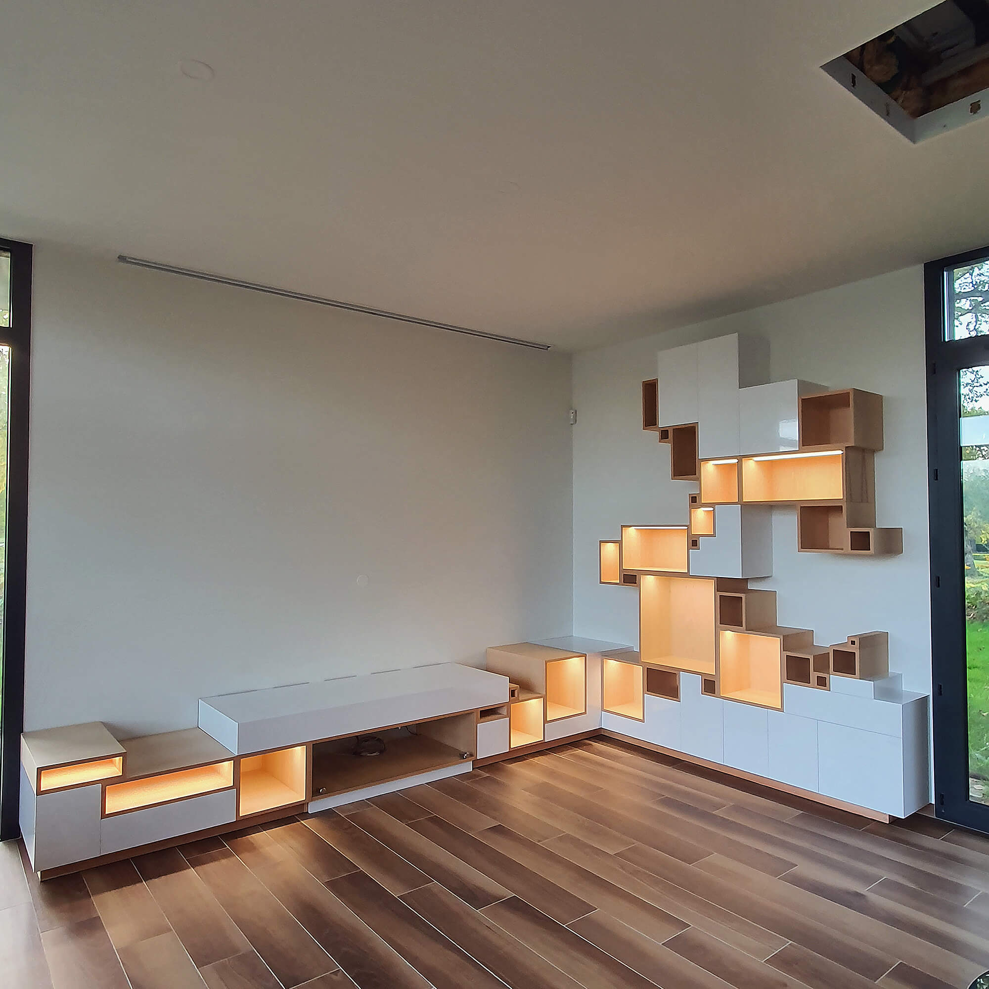 Fabrication et empilement selon plan client de boîtes de toutes sections et d’égale profondeur, dans les finitions suivantes : médium MDF stratifié blanc brillant et panneau latté plaqué hêtre, verni mat. Eclairage des boîtes plaquées hêtre par bande led. La construction comprend un meuble bas image et son, avec des tiroirs montés sur coulisses mécaniques.