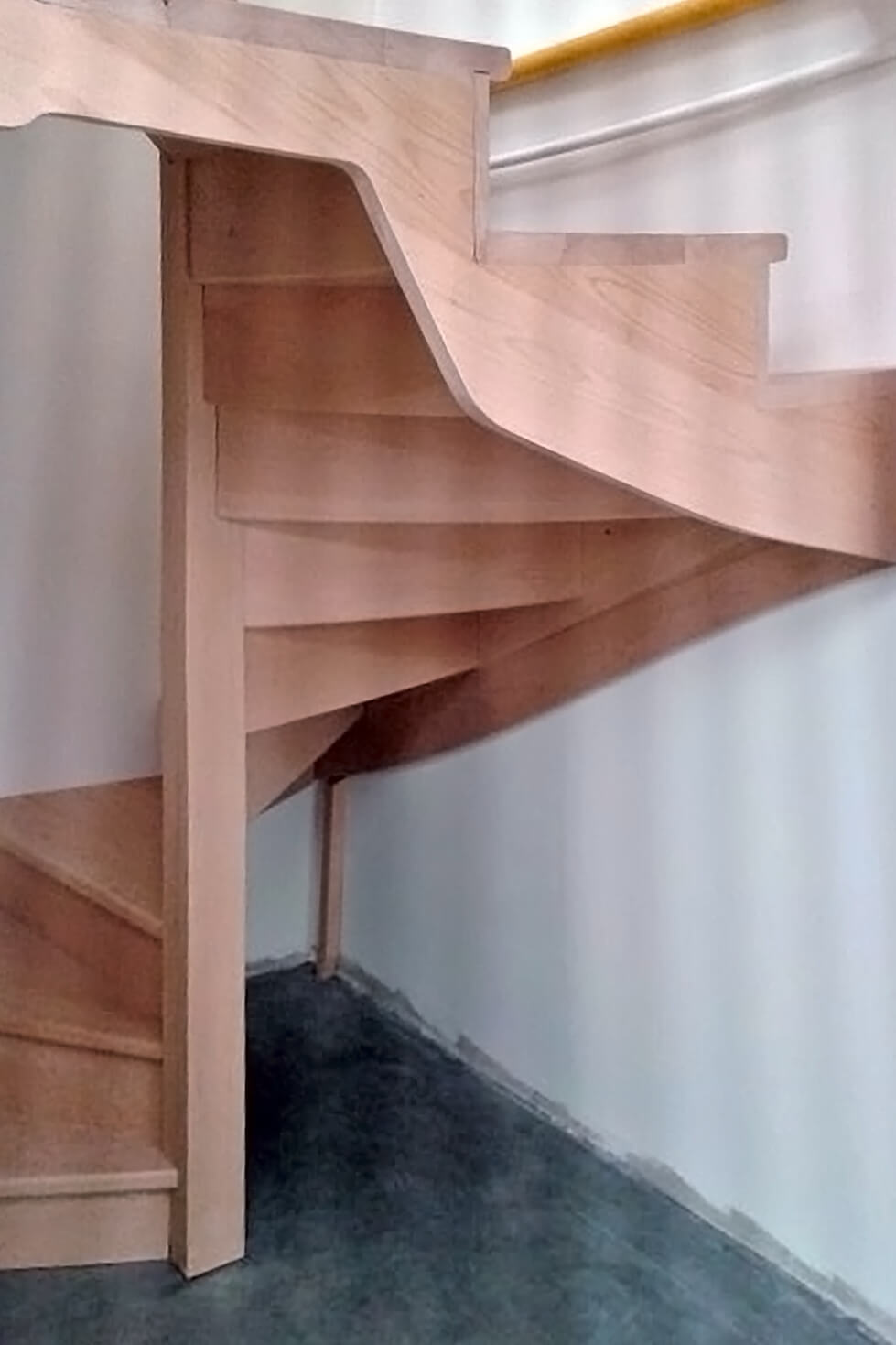 Escalier en hêtre massif tournant autour d’un poteau central carré. Crémaillère partiellement apparente avec découpe pour passage de tête. Petit palier d’arrivée avec garde-corps à balustres droits. Finition : vitrification mate grand passage.