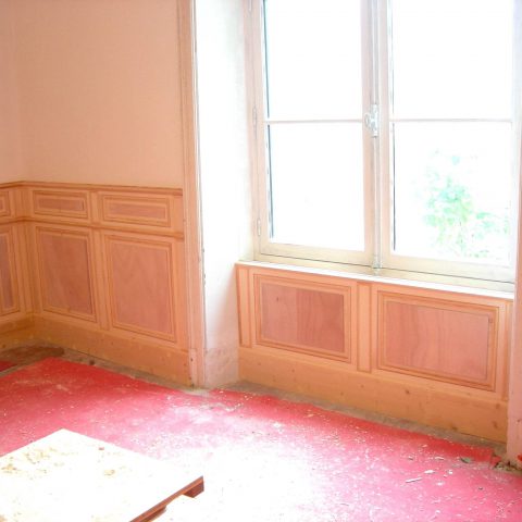 Fabrication à l’identique de lambris panneautés sur les bas de murs afin de retrouver l’esprit du XVIIIème siècle. Comprenant des emboîtures et des moulures à grand cadre. Panneaux à plate-bande de garnissage. Ensemble prêt-à-peindre.